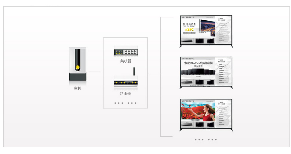 索尼BRAVIA商用定制液晶电视机提供的功能为您提供完善的应用方案。 服务器基于开放的HTML5协议为框架系统,加上索尼BRAVIA液晶电视具 备的商用功能;系统集成商只要通过网线就可以把这些难题化繁为简。