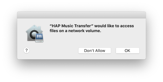 否则,如果您选择不允许,您将不能传输音乐文件。 此时,请在[系统偏好设置] > [安全性和隐私] > [隐私] > [文件和文件夹] 中,找到“HAP Music Transfer”的[Network Volumes]