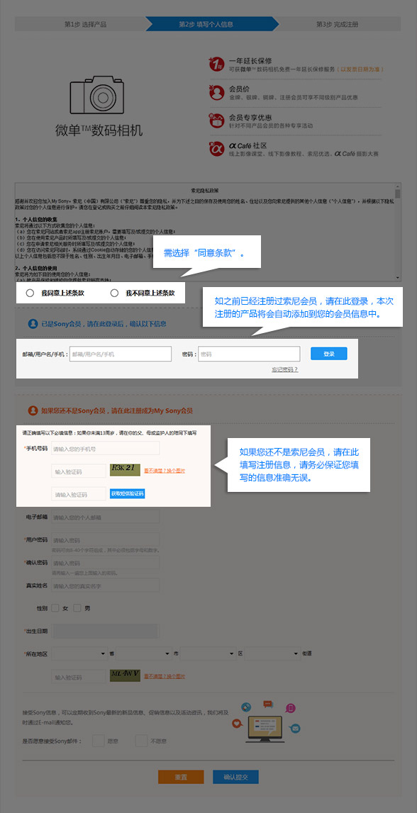 如果您已经是索尼会员,请登录并确认个人信息后提交。