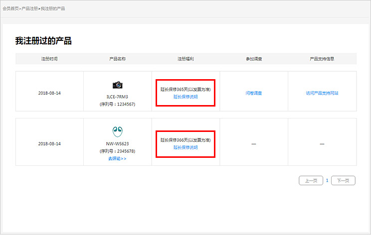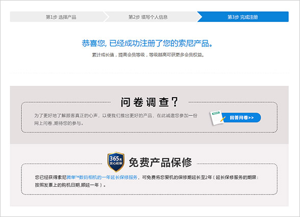 恭喜您完成产品注册,索尼数码影像主机产品和部分音频产品成功注册可获索尼官方延长保修服务,产品注册信息和延保信息可在导航栏“我的账户”>“我注册过的产品”中查询。