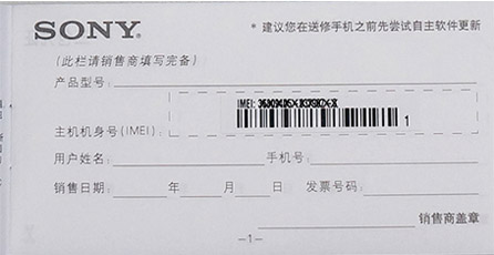 IMEI号位于产品保修卡上的“主机机身号(IMEI)”栏,IMEI号为15位数字。不含特殊字符“-”如下图:
