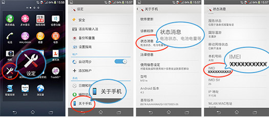 打开您的手机, 第一步选择“设定”,第二步选择“关于手机”,第三步选择“状态消息”就可在IMEI中看到您的手机IMEI号。