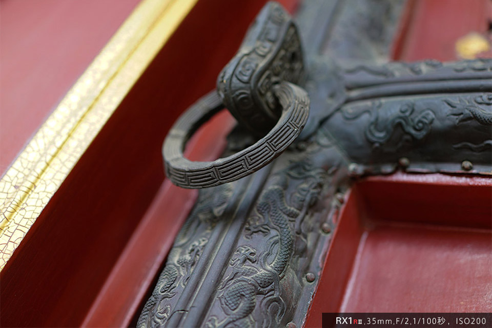 拍摄了大殿北面一个门环的局部,光线很暗,我设置感光度为ISO 400,1/100秒的快门速度,光圈f/2,设置"微距模式"拍下了这幅照片,可以看出镜头在最大光圈时优秀的影像表现,无论是画面中心的门环纹理,抑或边缘部分的金漆龟裂……