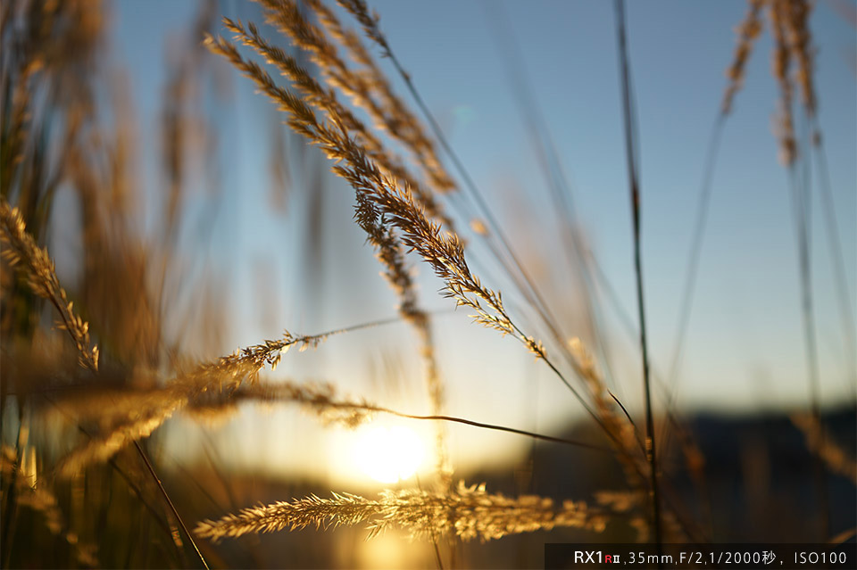 放在了地上,翻起了折叠的取景屏,我突然看到了这样的"景",阳光抚摸着草丛,小草也金灿灿地发出光明,晚风中飘逸的草丛,又在抚慰着我的心情。把光圈开到最大(f/2.0),再设置镜头于"微距"中,按下快门,拍摄下我心中的风景。