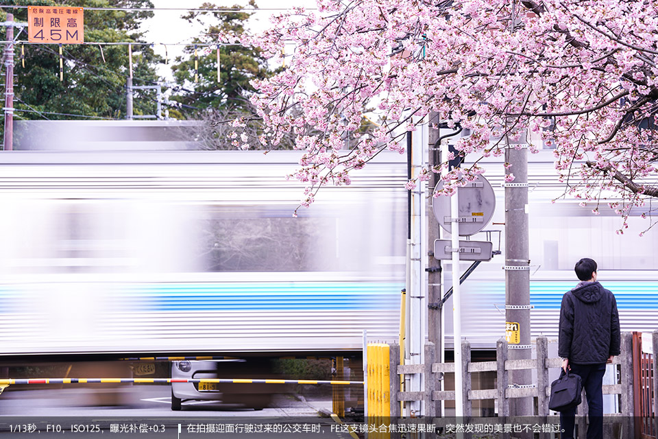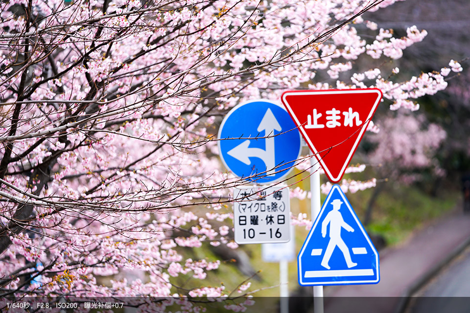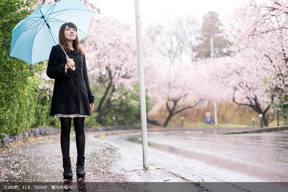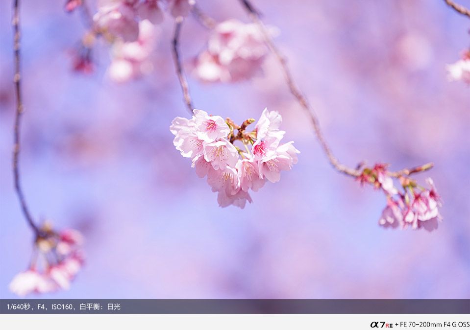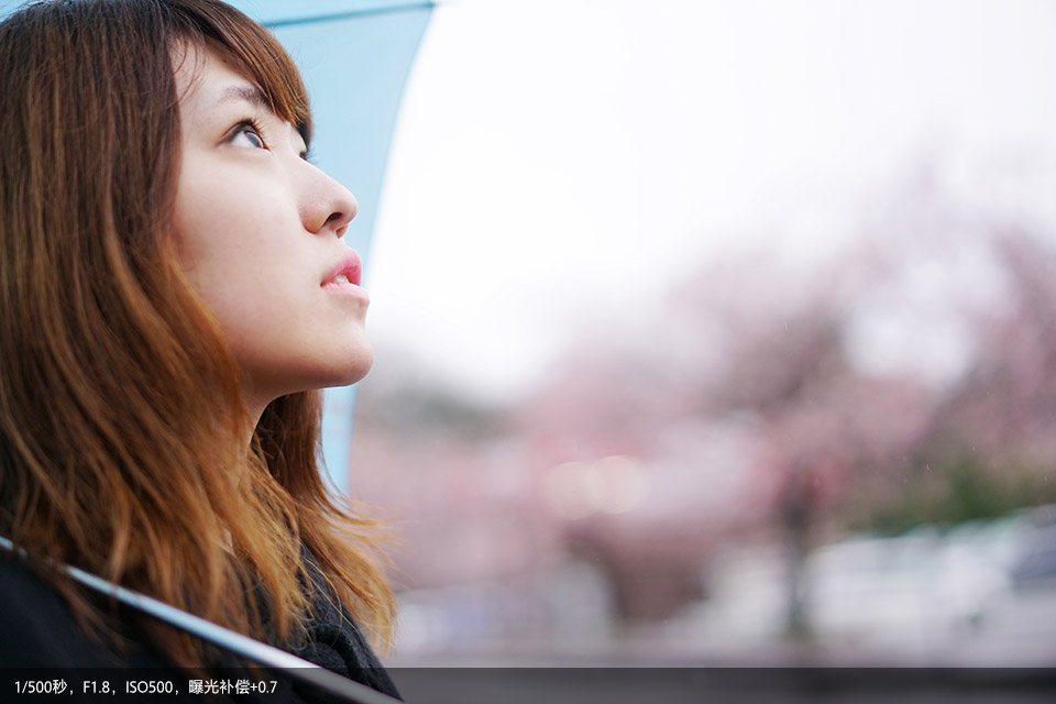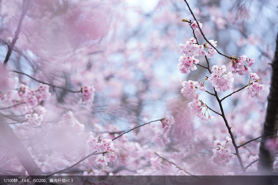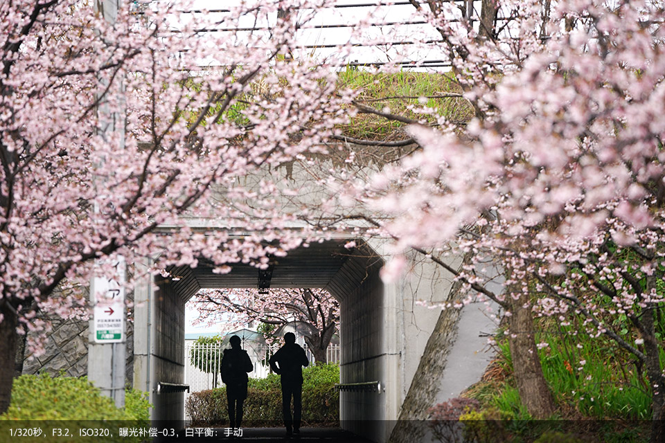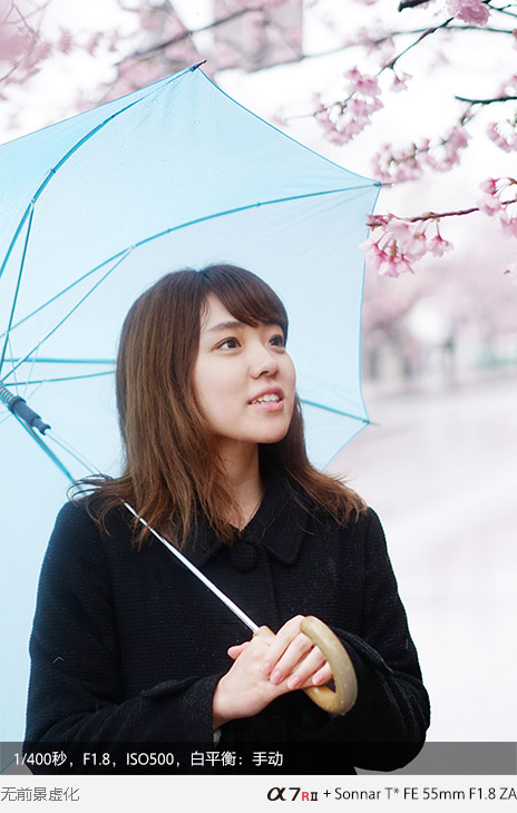 其实背景虚化大家肯定非常娴熟了,那在实际应用中还可尝试前景虚化。透过花丛拍摄人像,位于镜头前方的樱花会融化成浅粉云朵,为画面增添浪漫色彩。