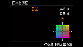 按转盘右键进入白平衡调整菜单。可使用方向按键调整适合的色彩偏向。