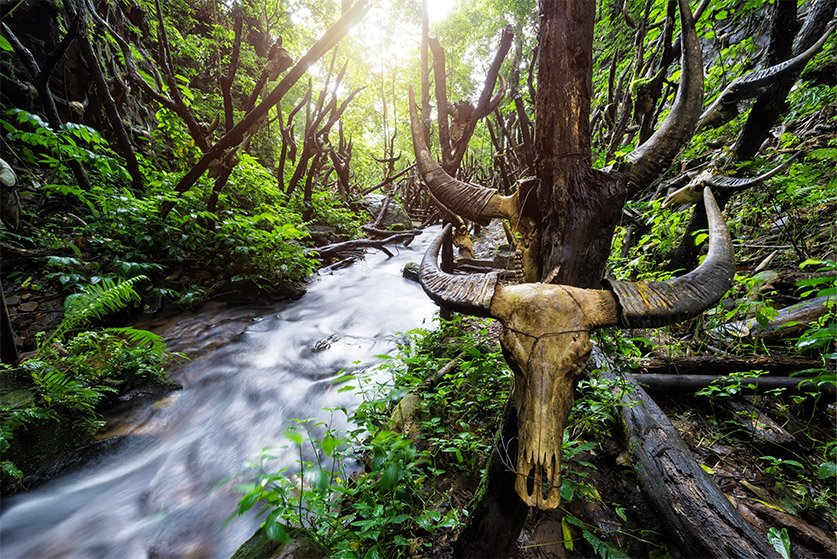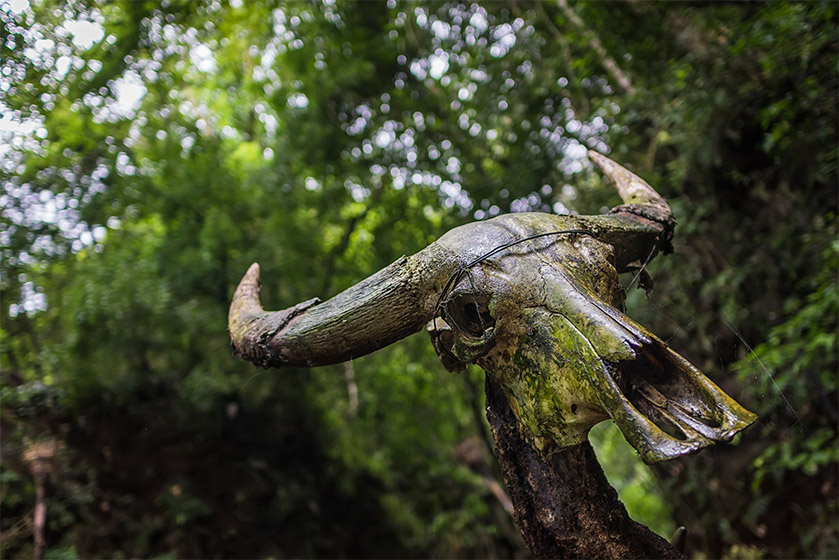 同样是拍摄云南龙摩爷圣地的牛头,当使用索尼E10-18mm F4 OSS超广角变焦镜头拍摄时,画面的视觉冲击力大大提升,夸张的透视效果带入了更多的环境因素,同时也让牛头更显霸气的。