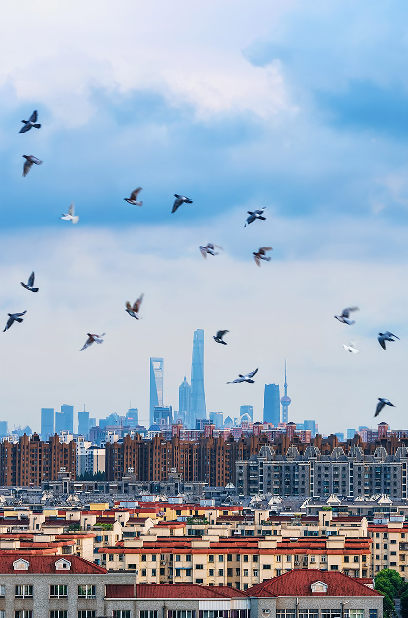 下图中,近处飞起的鸽子和远处上海的地标式建筑在长焦镜头的压缩下融为一体,画面动静结合充满活力。