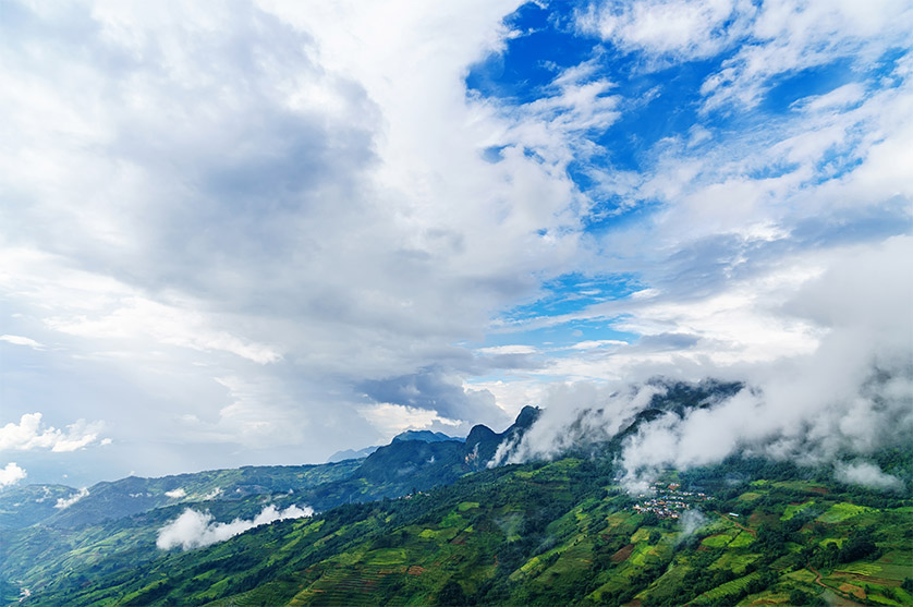 + FE70-200mm F4 G OSS 94mm F5.6 1/200s ISO400再比如在山顶观景台拍摄风光照片时,因为机位的限制,标准镜头拍摄的画面比较平淡,云、山和村庄都不太突出。