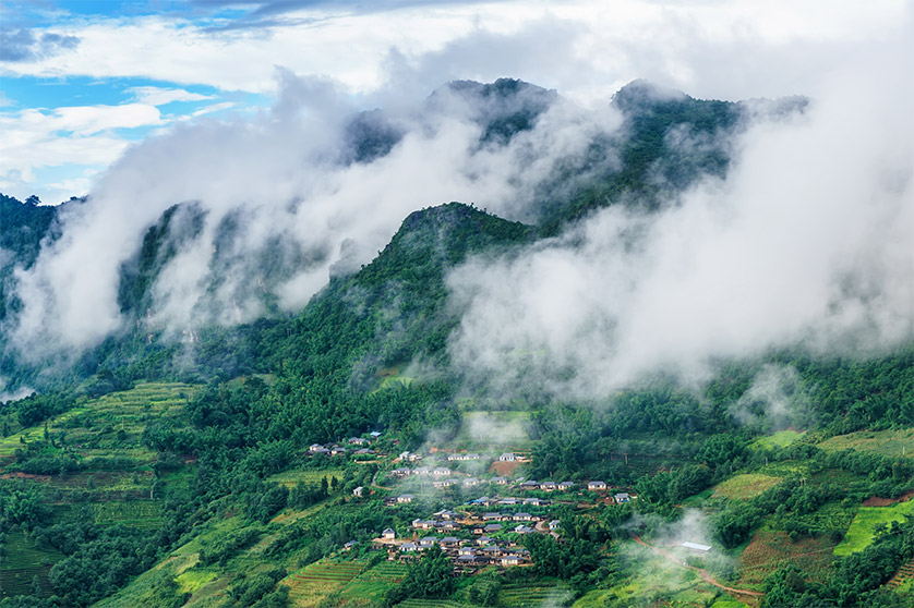 + E10-18mm F4 OSS 10mm F9.0 1/125s ISO100依旧是相同的拍摄位置,长焦镜头的使用则再一次扩大了我们的创作空间。在长焦镜头之下,山中的村庄清晰可见,云层和山体的呼应更加的紧密,共同烘托出山村的安宁与神秘。