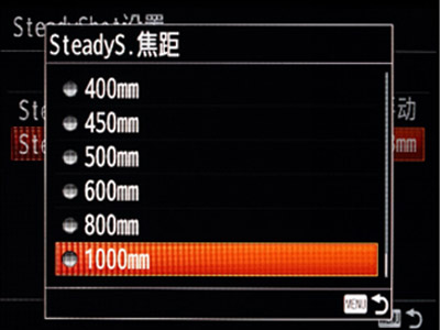 当转接非FE卡口镜头*,特别是没有电子触电的镜头时,steadyshot调整无法读取镜头焦距,适配5轴防抖方案。因此选择手动,并设置焦距。焦距的选择范围包含8mm到1000mm。