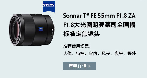 + Sonnar T* FE 55mm F1.8 ZA 快门1/30s 光圈F1.8 ISO 320微光环境下使用Sonnar T* FE 55mm F1.8 ZA镜头,可以有效的减低安全快门至1/15秒,可以有效的降低感光度。但这张照片拍摄时依然采用了1/30秒的快门,主要是考虑到模特本身可能会动,毕竟不是静物,保持1/10s不动会辛苦一点。