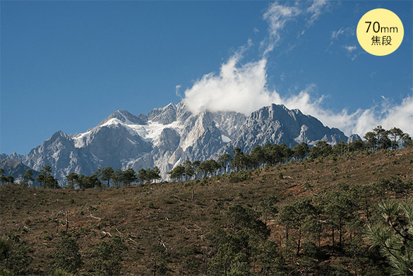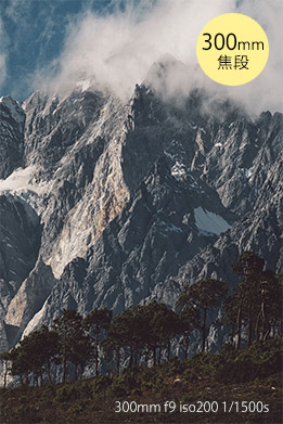 长焦取景后画面被压缩,将RX10的焦段推至300mm的时候发现正好可以将雪山与树木完美收纳。