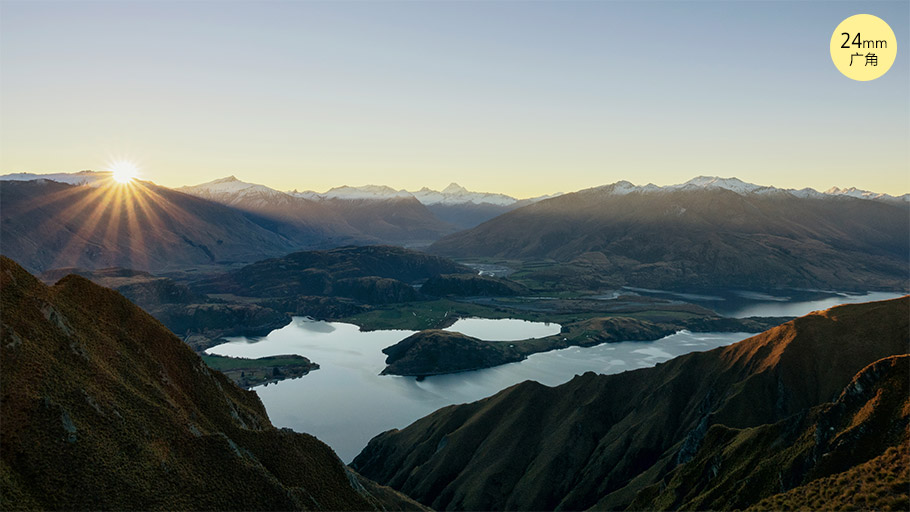 新西兰罗伊峰顶,南阿尔卑斯山脉日落的瞬间。登高之后视野开阔,利用RX10Ⅳ的广角端24mm将远处的山峰、湖泊和日落净收眼底。前景V字型的湖与远处的山峰相得益彰。