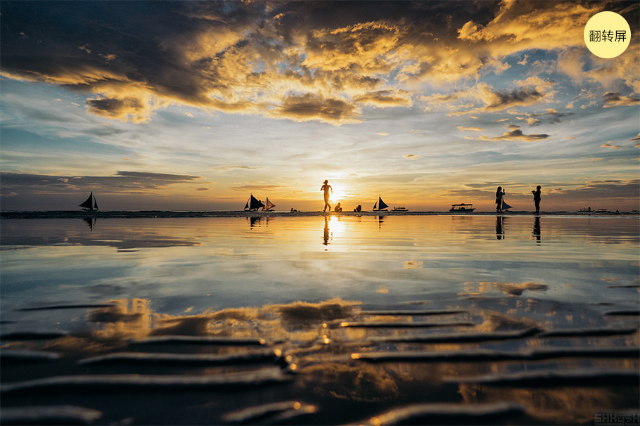 长滩岛白沙滩,临近日落时刻海边的天空云朵的形状和颜色都非常完美。在沙滩上寻找到一片不错的倒影水塘,利用翻转屏取景,将相机贴近地面拍摄以获得完美的倒影效果。在拍摄的过程中时常会有各种人影钻入我的镜头中,不过这些人没有成为照片中的杂质,反而赋予了这张风光图人情的温度。利用相机的连拍功能,我抓住了这一完美时刻。