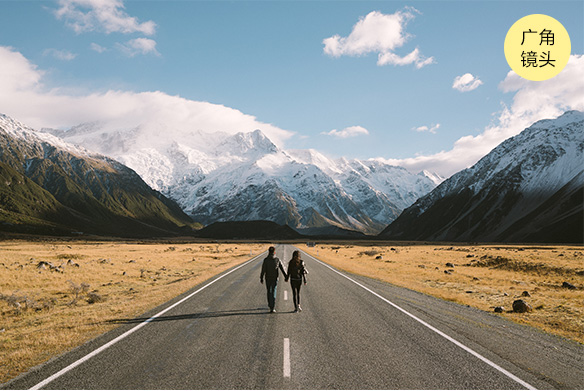 新西兰南岛的一段笔直公路,通向远处平地而起的雪山。照片利用RX10M4的广角端进行拍摄,因为这种场景下广角镜头能够拍出道路的延伸感,非常适合公路自拍。让同行的一对情侣沿着公路向前行走,利用中心构图的构图方式完成了这张旅拍作品。