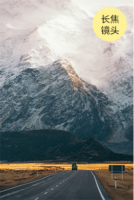 同样的位置,长焦取景后,远处的光吸引了我的注意力。长焦竖构图后取景仅剩公路和雪山的侧立面,画面简洁不少。为了让照片故事性更强,等待了一会儿后出现了一辆行驶向雪山的汽车,好像也在诉说着一段旅途中的故事,按下快门完成拍摄。