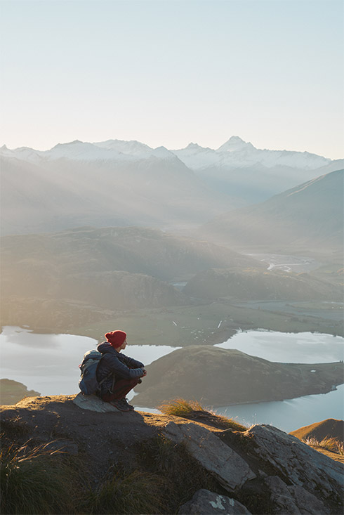 【寻找有趣的人物】同样是新西兰南岛的罗伊峰,除了山顶广阔的大场景风光之外,由于罗伊步道也是热门的徒步线路,一路上经常也能碰到热爱爬山,热爱大自然的驴友。到达山顶后就发现一位徒步爱好者坐在山顶的岩石上享受着温暖的夕阳 。