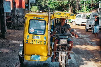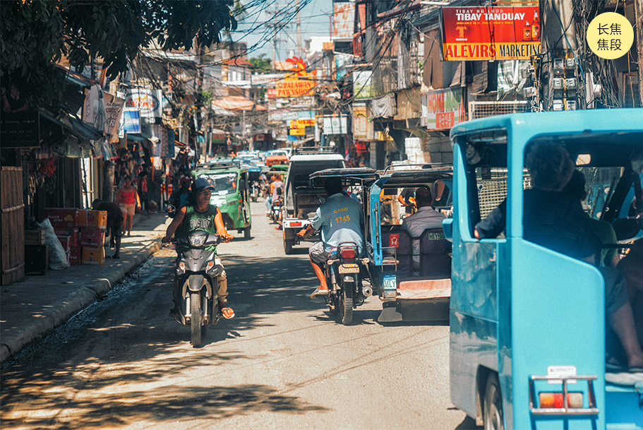 上图摄于菲律宾的长滩岛。岛上的主要交通工具就是照片中的机车——突突车。虽然比较破旧,但当地的司机都会为自己的机车刷上鲜艳的颜色彰显自己的个性,在岛上也是一道靓丽人文景致。
