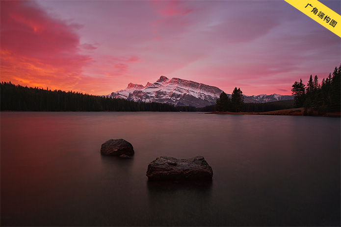 长曝光后湖面拉丝干净了不少,不过广角构图下湖面占据了整个画面的下半部分,太多的湖水会使照片的前景过于单调,缺乏着眼点。于是构图时我寻找了两块湖中的岩石作为前景,从而丰富了整个画面。
