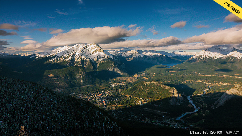 上图中的机位在加拿大班夫国家公园的硫磺山顶,视野上可以俯瞰大半个班夫国家公园。这个位置的地景就是非常好的前景,与视觉中心的落基山脉和背景的蓝天相互辉映,构成一幅气势恢宏的景色。