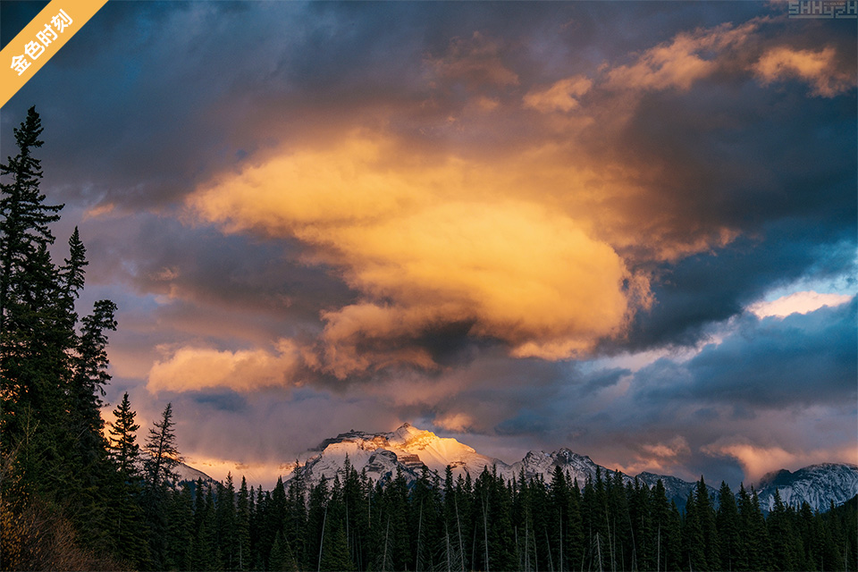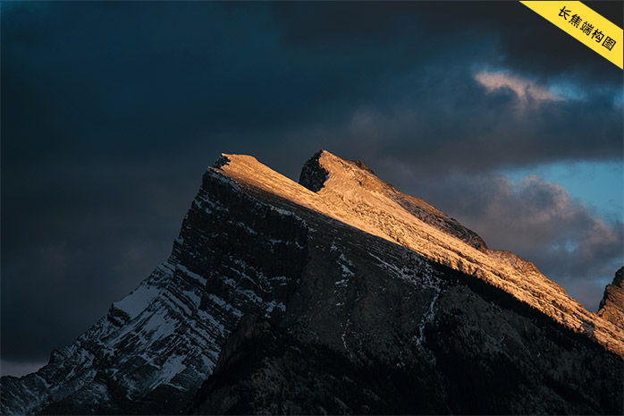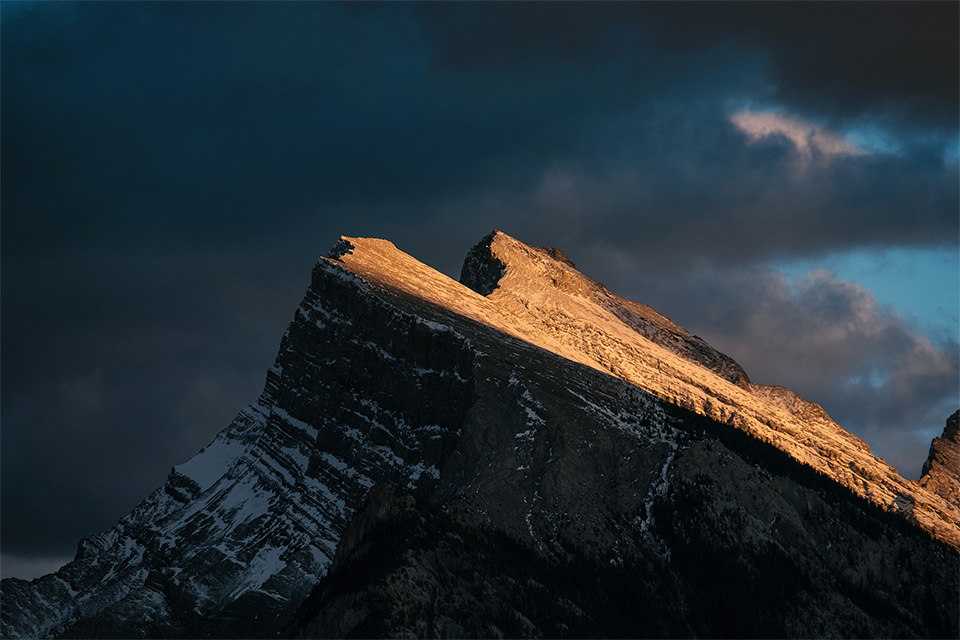班夫朱砂湖对岸远处的山峰形状非常有特色,临近日落时刻,山峰顶部受到来自右侧方阳光的照耀后更显气质。我利用RX10的长焦端取景山峰,使亮眼的山峰作为拍摄主体,阴云和山的阴面构成的画面背景以及揉成一色的背景冷调,与暖调的山峰形成了鲜明的对比,让人眼前一亮。