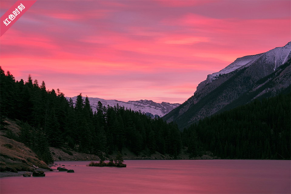 红色时刻出现在日出前15-30分钟,以及日落后15-30分钟之间。这个时间段内太阳即将升起或者刚落下不久,色温偏红。如果天空中云量及云在天空中的位置合适,那么太阳会将云朵染红,有很大的概率可以看到自然界最美的景色之一——火烧云。