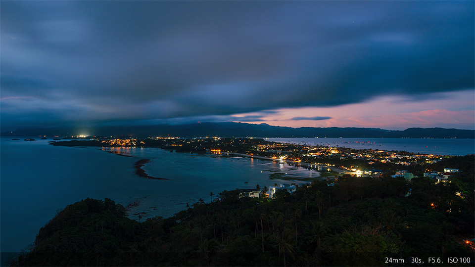 菲律宾长滩岛,在岛上的最高峰卢霍山俯瞰海岛全景。日出前的天空阴云密布,将光圈设置到了f5.6后依旧需要30s的快门时长才能让画面曝光正常。长曝光后云朵以及海面拉丝显得非常的顺滑,让整张照片看上去简洁不少。