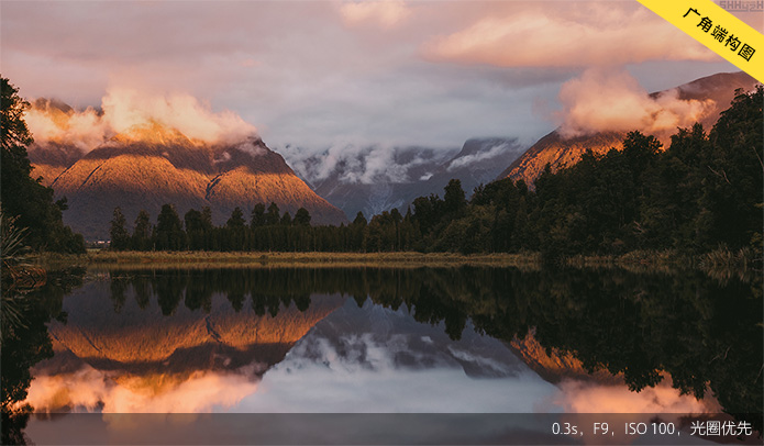 图摄于新西兰马瑟森镜湖,静止的湖面反射了树林与山坡。这种环境下就不需要为寻找前景而发愁,倒影本身就是非常出彩的前景。