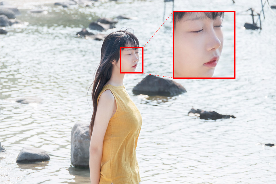 我们找了一处脸部有局部遮挡的位置,当按住 “眼控”键时对焦点依旧可以牢牢地追住模特的眼部。