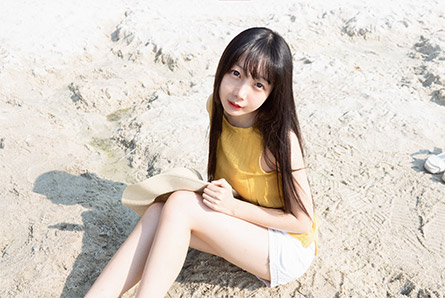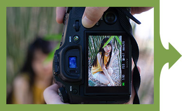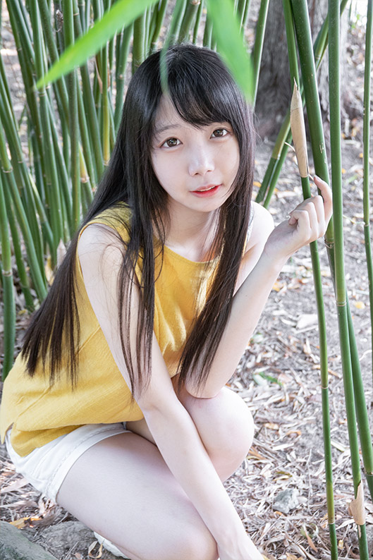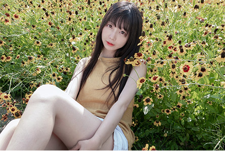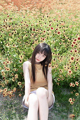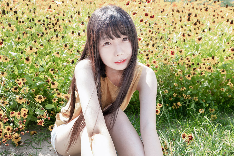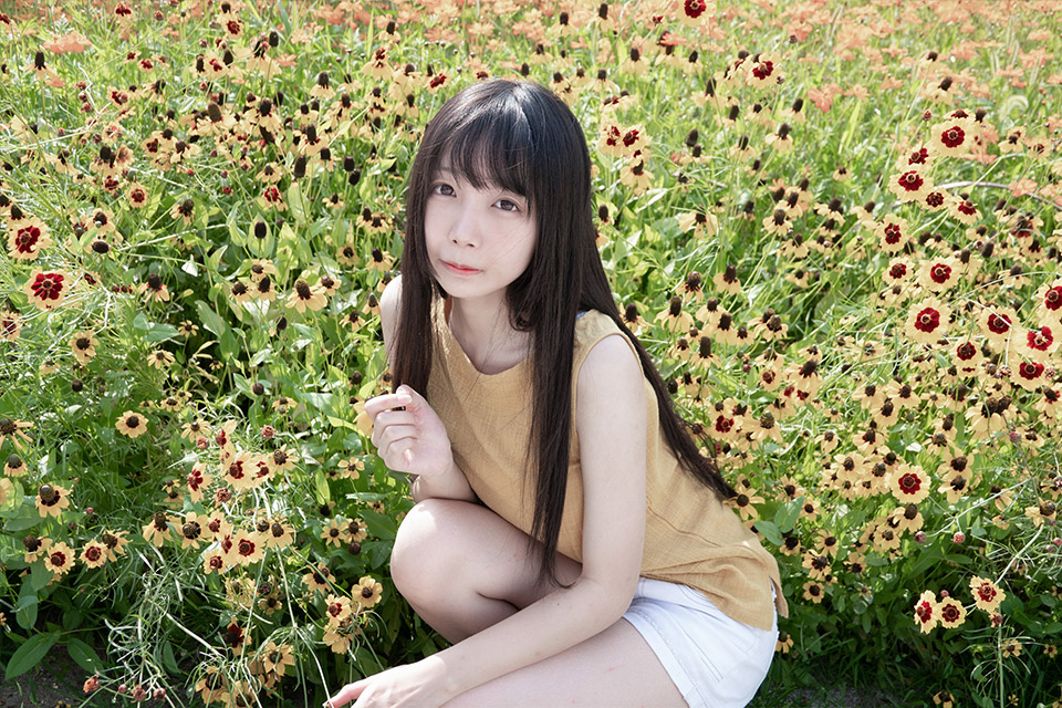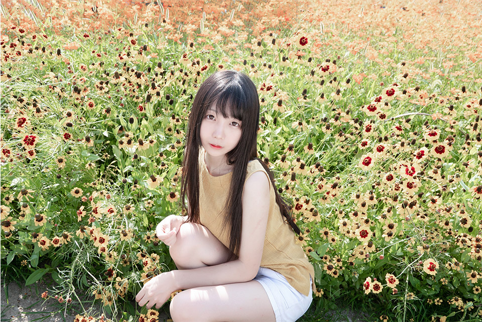 在公园里拍摄首先需要寻找合适的小清新背景,比如像这样的花丛,让人物尽量找空荡的位置坐入花丛内。通常花都是基本在同一个高度的,所以如果你用平视角拍摄就无法把后面大片的花朵效果拍摄出,所以利用高机位俯拍这样的花丛人像,就能拍摄出这样花丛中的感觉。